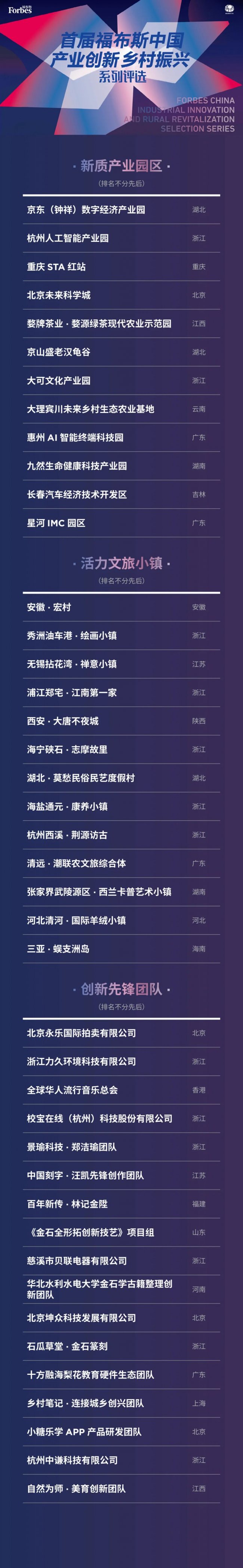 以下为“首届福布斯中国·产业创新乡村振兴系列评选”的最终结果:
