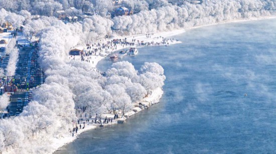 在吉林市万缕银丝雾凇观赏带,游客络绎不绝。(张景峰/摄)
