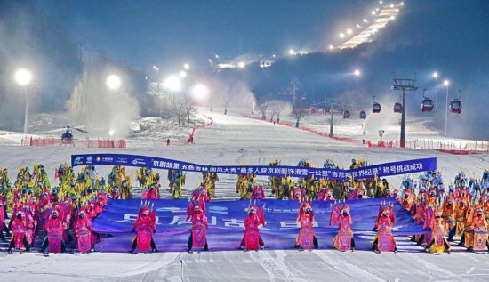 在吉林市中旅松花湖滑雪场,“最多人穿京剧服饰滑雪一公里”吉尼斯世界记录称号挑战成功 图片来源:吉林市融媒体中心